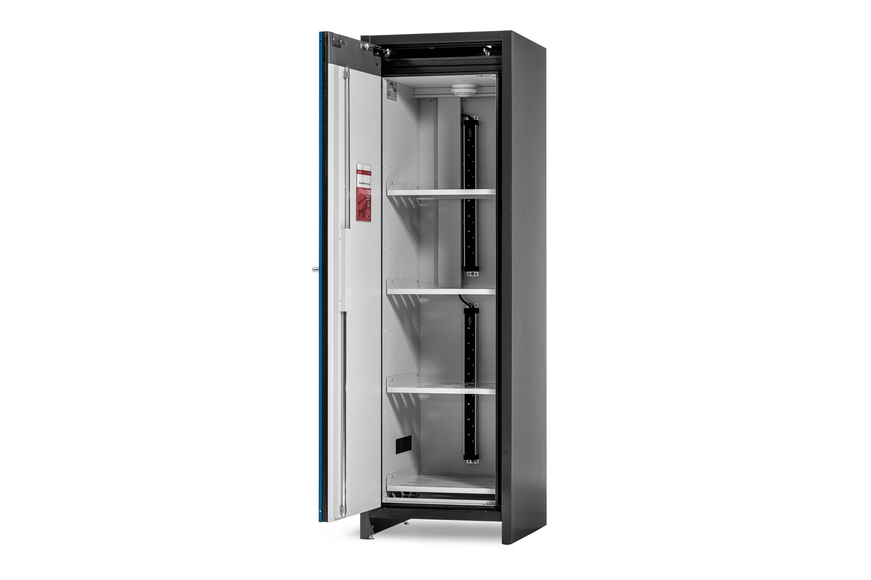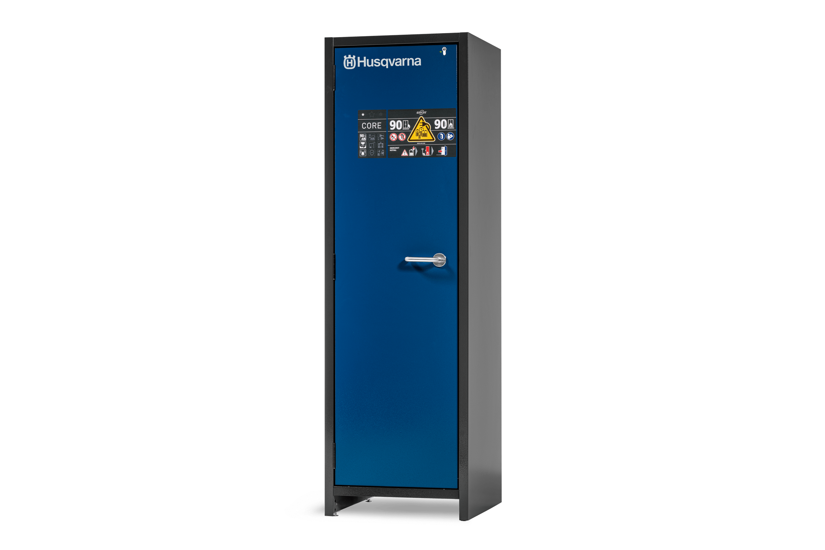 L’armoire de chargement de batterie Husqvarna M est conçue pour le stockage et le chargement sûrs et approuvés des batteries lithium-ion. Cette armoire 400V à une porte offre une résistance au feu de 90 minutes de l’extérieur vers l’intérieur et de l’intérieur vers l’extérieur*. Elle est équipée d’un détecteur de fumée, qui permet une détection précoce des incendies naissants, et d’un système d’alarme sans potentiel qui garantit que les alarmes sur site sont transmises rapidement. Des prises de courant et des étagères prêtes à l’emploi sont incluses. – – *Conforme aux normes EN-14470-1 et EN-13631