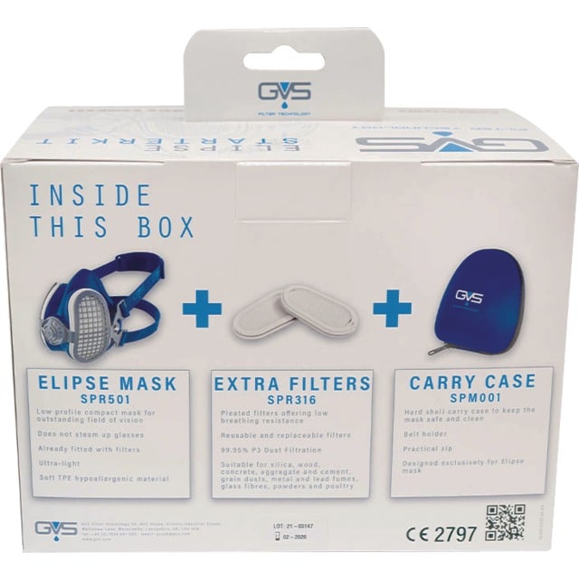 Ce kit complet comprend un demi-masque P3, deux paires de filtres P3 et une sacoche de protection.