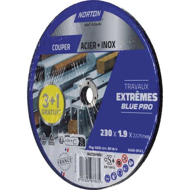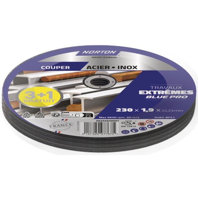 DISQUE A TRONCONNER METAL INOX PLAT 230X1,9X22,2 MM LOT DE 3+1 OFFERT EXTREME BLUE PRO NORTON x5