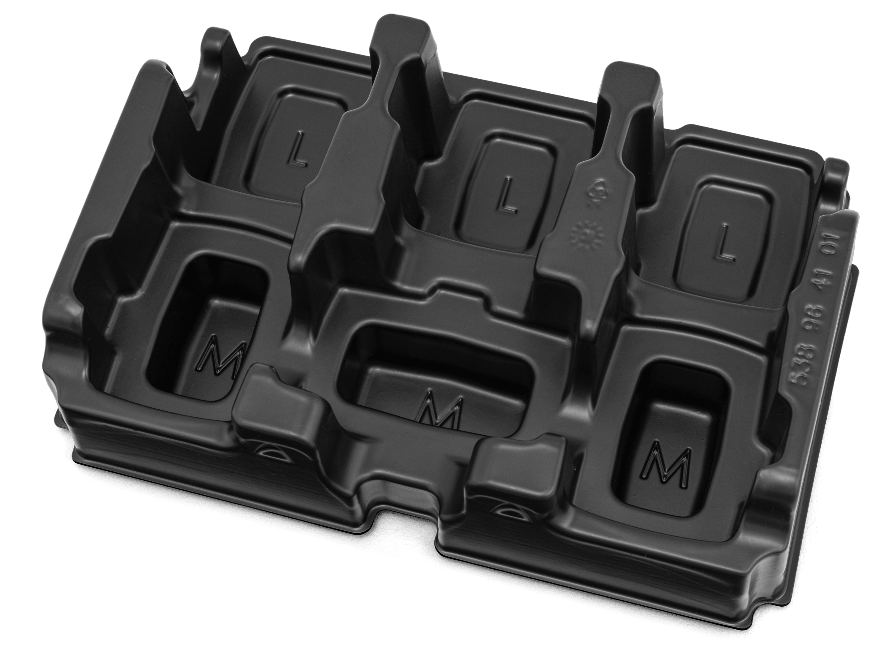Robust insert for Husqvarna battery box, tailored for up to 3pcs of 36V M size* batteries and 3pcs of 36V L size** batteries. – *Husqvarna 36V M size batteries = BLi10/Bli20/40-B70/40-B140/BLi100/BLi200/BLi200X – **Husqvarna 36V L size batteries = Bli30/Bli300