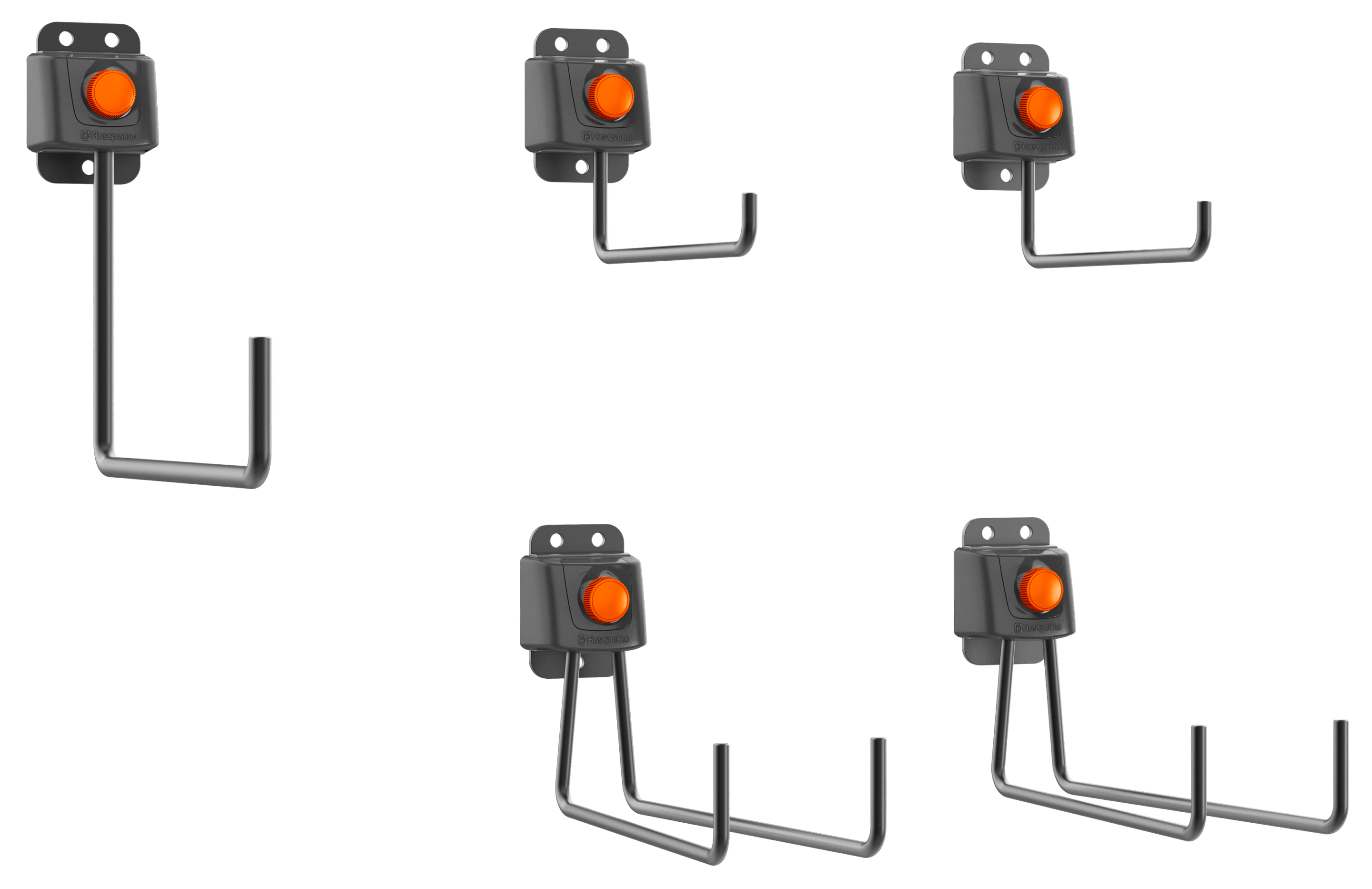 Accessoire du système de rangement Aspire™, ce kit de 5 crochets est optimisé pour s’adapter à toute la gamme Husqvarna Aspire™ ainsi qu’aux outils de jardin les plus courants de votre abri, tels que les outils à main, les tuyaux d’arrosage ou les balais. Chaque crochet peut être fixé au rail de rangement mural Aspire ou installé directement sur le mur, ce qui permet un rangement intelligent et efficace. Disponibles en différentes tailles, ces crochets simples et doubles en matériau de qualité supérieure organisent de manière pratique et soignée tous vos outils de jardinage dans un espace restreint.