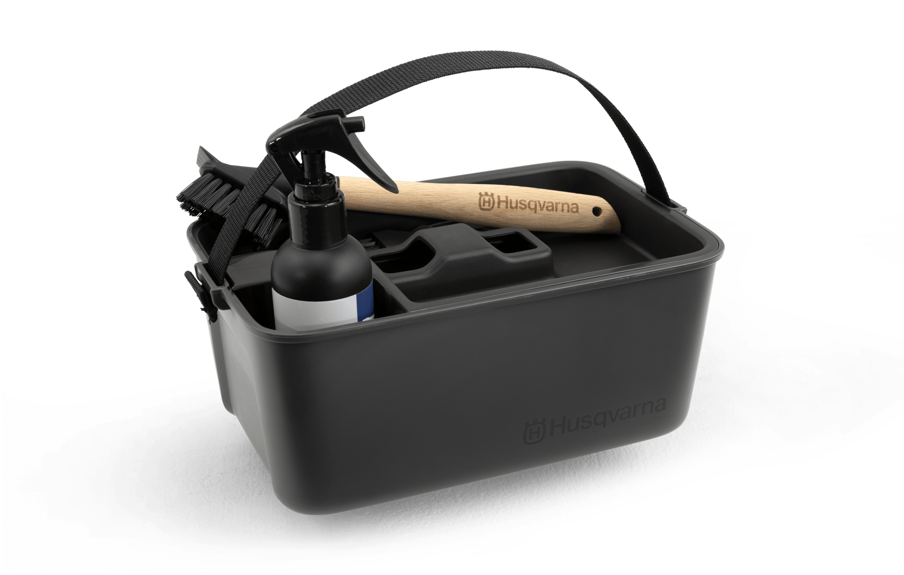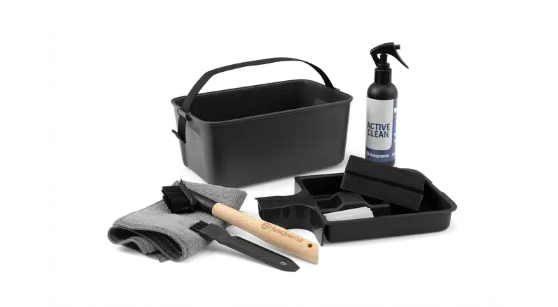 Un kit de nettoyage et d’entretien qui permet de maintenir facilement le robot Husqvarna Automower® en parfait état. Ce kit contient tout ce dont vous avez besoin pour enlever l’herbe et la saleté et nettoyer la tondeuse robotisée pendant la saison. Le kit comprend deux brosses – une petite pour les surfaces étroites et difficiles à atteindre et une grande qui peut être utilisée avec un tuyau d’arrosage. Le spray Husqvarna Active Clean est facile à appliquer, très efficace pour éliminer la saleté, sans phosphate et biodégradable. Le rangement et l’organisation des outils et des lames sont facilités par les compartiments prévus à cet effet dans la boîte.