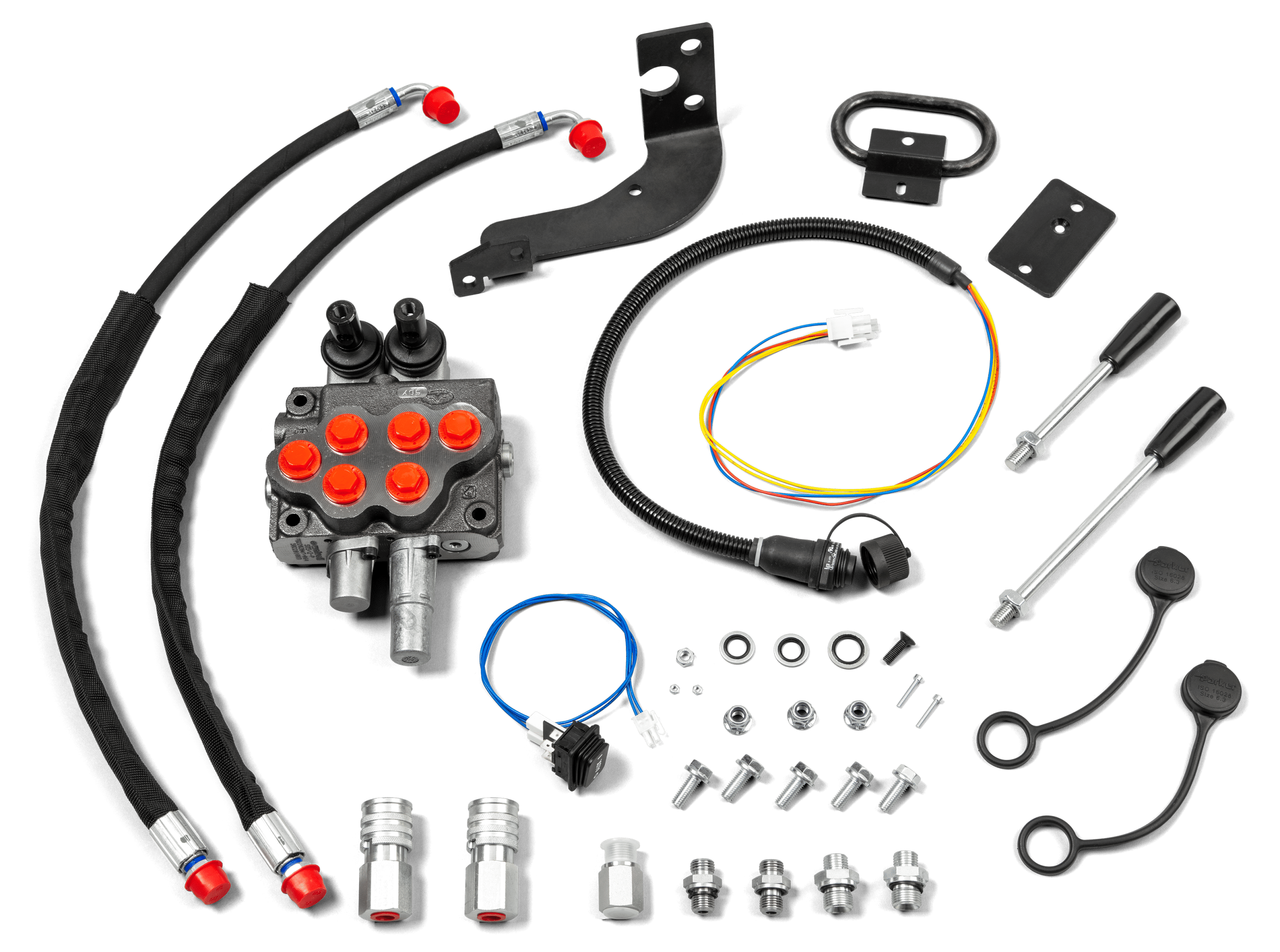 Kit necessary for adaption of front-mounted attachments with hydraulic function. Includes two auxiliary hydraulic connections, valve, switch and hoses with connectors and wires.